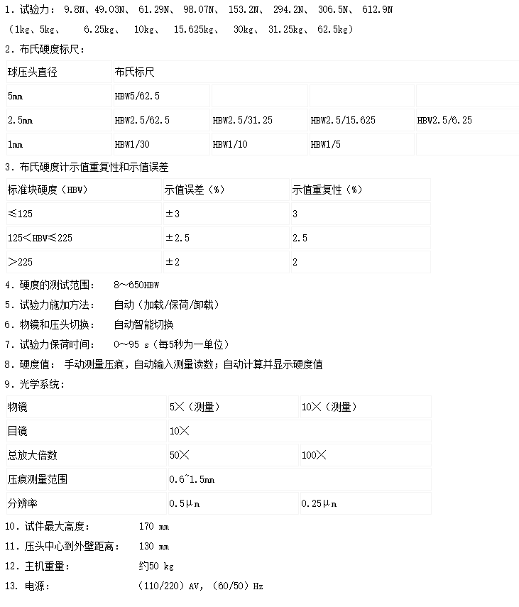 1、本儀器具備7級試驗力,8種測試的布氏標尺任意選擇;